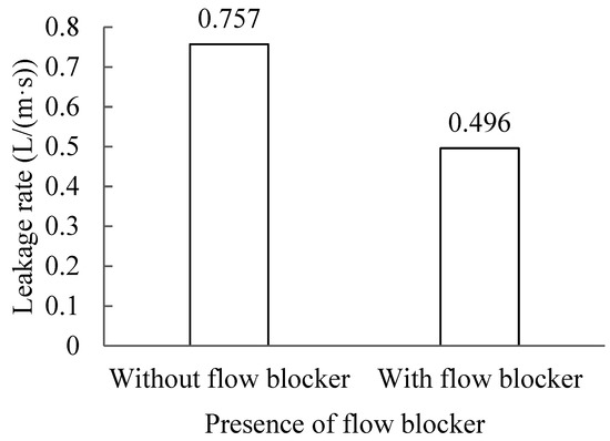 Figure 12 presents the leaked-air rate with and without the flow blocker, i.e., a comparison between Cases 1 and 16. The leaked-air rate without the flow blocker was 0.757 L/(m·s), while it was 0.496 L/(m·s) with the flow blocker. Placing a flow blocker in the middle of the insulation layer reduced the leaked-air rate by 34.5% because the flow blocker increased flow resistance in the insulation layer, as shown in Figure 13. There was a significant pressure drop across the flow blocker, which effectively minimized the leaked-air rate.