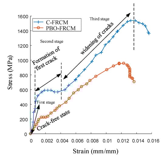 As observed in Figure 1, the FRCM system under tensile loading is comprised of three distinct stages: un-cracked (Stage I), crack development (Stage II), and cracked (Stage III). There was no evidence of a crack in the first stage, and the response was linear throughout. The change in slip in the graph corresponds to the formation of the initial crack. The mechanical properties of both the mortar and the textile (PBO and C-FRCM), as well as stress transfer from the textile to the matrix, all have a direct effect on the failure mechanism []. The third stage is characterized by the propagation of cracks and the widening of existing cracks. As a result, the ultimate failure mode manifested itself in one roving and propagated rapidly to the other ones.