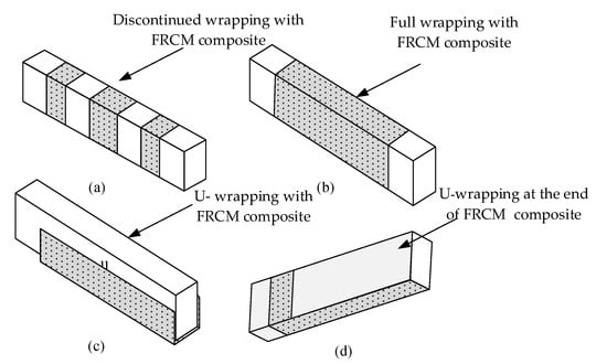 Following the catastrophic damage caused by the gas explosion in the Ronan Point tower [], several government agencies and international code writers sought to improve guidelines and recommendations to mitigate or prevent the potential for such catastrophic collapses. In addition, due to extra loads, environmental factors, cracks, and deficiencies in designing and implementing concrete structures, rehabilitation is more often vital rather than reconstruction for concrete members []. Hence, a series of research studies have been fulfilled on beams strengthened with the FRCM system and the effect of various parameters, including the type of FRCM systems (i.e., C, basalt, PBO, and G), configurations (viz. full-, U-, and W-wrapping), surface textiles (that is, uncoated and coated), the number of layers, the type of matrix (namely, cement, and resin), anchors (i.e., composite, mechanical, near-surface, and externally bonded), the effect of fiber orientation (i.e., 45° and 90°), the impact of high temperatures, the type of mortars, the effect of corrosion, the impact of fatigue, the effect of internal steel reinforcement, and the impact of value fabric, have been so far investigated, whose results in this line are reported in the following sections. Meanwhile, different methods for beam strengthening are presented in Figure 2. As seen, four different flexural strengthening methods of beams with the FRCM system are depicted under flexural loading, namely full wrapping, U-wrapping, U-wrapped at the end of FRCM, and discontinued wrapping.