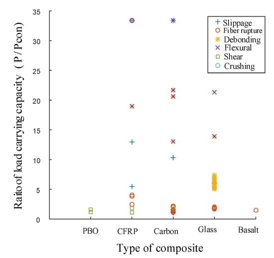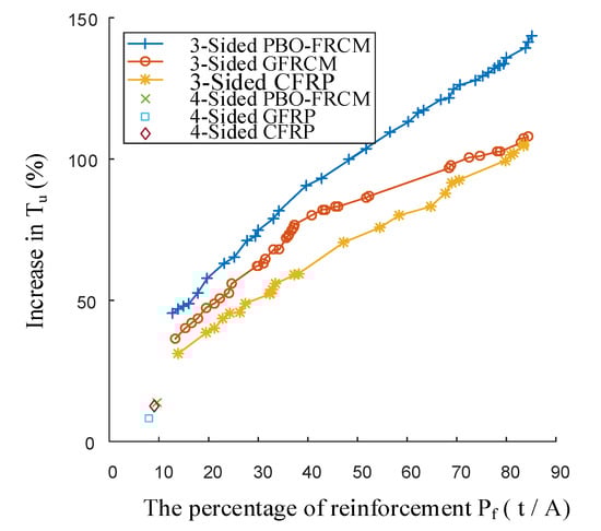 Regarding the impact of the FRCM materials on examining the torsional behavior of specimens, materials strengthened with PBO-FRCM have also been compared with C-FRP and G-FRP composites, suggesting that PBO-FRCM composites have followed an increasing trend in enhancing torsional strength than C-FRP and G-FRP composites as shown in Figure 6 [].
