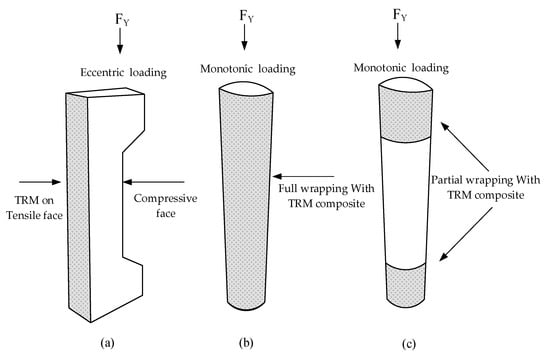 - Ombres, L.; Verre, S. Structural behaviour of fabric reinforced cementitious matrix (FRCM) strengthened concrete columns under eccentric loading. Compos. Part B Eng. 2015, 75, 235–249. [Google Scholar] [CrossRef]
