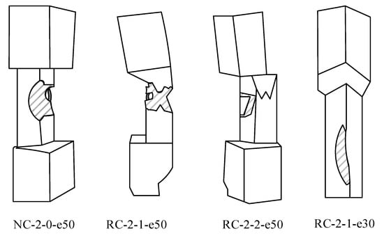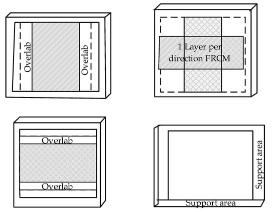 In the case of strengthening configurations subjected to flexural behavior, some authors [,] investigated the FRCM U-shaped at the ends of beams (i.e., as an anchorage). Their findings indicate that this strengthening configuration system contributes significantly to delaying failure modes such as FRCM end debonding when compared to FRCM-strengthened beams without end bonding []. On the other hand, although U-shaped anchorages do not necessarily enhance the effectiveness of the configuration systems in terms of load-carrying capacity, they do improve ductility and reduce unexpected failure modes []. In addition, D’Ambrisi et al. [] indicated that there was no difference in failure modes for beams composed of continuous U-shaped strips and beams composed of U-shaped strips only at the beam ends, indicating that an increasing load-carrying capacity was represented by approximately 8% for beams composed of continuous U-shaped strips. Meanwhile, due to the high cost of FRCM, full wrapping or four-sided strengthening of beams with FRCM is neither common nor feasible. Similarly, there are a substantial number of eccentric structures, such as tunnel linings and calvers, which cannot be wrapped due to their shape, size, or other characteristics [].