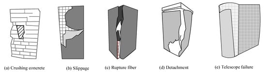 According to the data available, five FMs strengthened with the FRCM system under flexural behavior were observed (Figure 3a,b). Debonding accounted for 38% of FMs, while delamination was 4%, as shown in Table 4. Therefore, debonding could occur in those strengthened with the FRCM system because FRCM debonding was followed by the externally bonded technique. In the cases of debonding failure, fiber rupture, and slippage, load-carrying capacity also increases upon a rise in the number of textile layers, while the type of failure mechanism does not change them. Table 5 shows that the flexural crack is predominant on the FM in one textile layer, whereas debonding is much more common for two and three layers. On the other hand, the changes in the composite type have led to variations in the FMs based on the available data (Figure 3b). This could be concluded by the fact that the mechanical properties of materials have a key role in determining failure mechanisms. In addition, in Table 6, the percentage of the FMs is determined according to the composite type.