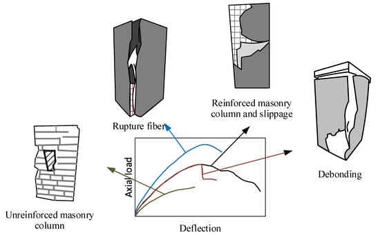 Over the past few decades, conventional strengthening methods, such as the use of externally bonded steel plates, have been facing serious difficulties; hence, fiber-reinforced polymers (FRPs) have shown suitable performance for such purposes [,,]. The use of FRP composites to reinforce and repair historical as well as concrete structures has been accordingly considered by many researchers thanks to its advantages [,,]. In fact, fiber reinforcement plays a substantial role in strengthening structural elements, especially in altering brittleness []. In this sense, FRPs are much more attractive in civil engineering and the construction industry owing to their unique benefits [,,], including weight resistance, corrosion resistance, high ductility, simple and high-speed implementation, and excellent adhesion to masonry substrates. FRP composites have also been utilized to attach to the surface of some elements via organic matrix-like epoxy resins [,]. In spite of their many advantages, a series of defects in such polymers have been similarly observed, i.e., difficulty in use at low temperatures, no use on wet surfaces, differences in materials applied between epoxy resins and concrete substrates, working hazards, thermal compatibility problems, different thermal coefficients between epoxy resins and material substrates, no fire resistance at high temperatures, the cost of epoxies, low glass (G) transition temperature, and insufficient vapor permeability [,]. As a result, poor bonds have often given rise to the premature delamination of epoxy resins as substrates [,].