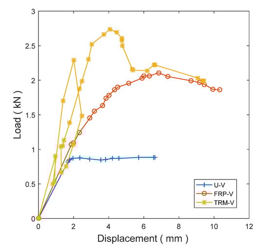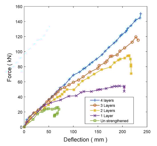 The significant difference between TRM and FRP rehabilitation systems could also be related to the elevation in the number of layers, especially the change from one layer to three layers. The TRM jackets were additionally more sensitive to augmenting the number of layers than the FRP jackets. Concerning the TRM jackets, the FM altered as the number of layers grew and the local damage to the TRM jackets changed toward the concrete substrate by converting the number of layers from one to two because it provided better mechanical interlock with respect to the overlapping of at least two textile layers []. According to recent research, increasing the number of the layers was associated with the growth is non-proportional to the effectiveness of the TRM jackets in the case of anchorage []; however, Tetta et al. [] demonstrated that beam shear capacity boosted proportionally with the rise in the number of the TRM layers based on the same type of textiles.