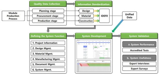 The quality information management system was developed in the following order: (1) collection of quality data generated during manufacturing in a modular factory, (2) standardization of quality information, (3) defining the system function, (4) system development, and (5) system verification. Figure 1 shows a schematic of the system development process.