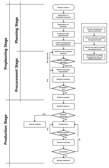 The quality management process in module production can be divided into a pre-preparation stage and a module assembly stage based on the time point in module assembly. The former can be further divided into planning and procurement stages. The planning stage starts with the distribution of the completed design documents. A basic management plan for module production is established based on the contents in these documents. The module production management plan refers to the overall management plan for quality management, production management, material import, etc. The initial plan becomes more detailed, according to the actual production environment, as production progresses. After the planning stage, the procurement stage proceeds according to the basic management plan. This phase primarily involves bringing in the main materials selected in the planning stage. The main tasks include selection of material suppliers, making material purchase requests, and material ordering. The factory production stage primarily involves inspection of incoming materials and construction works. After the inspection of the final activity, the module production quality management process is completed by shipping the finished module.