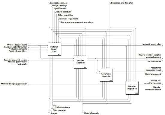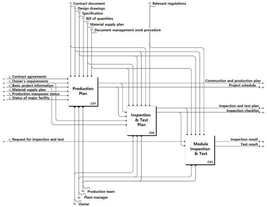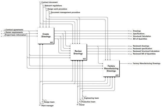 Figure 3 shows the standardization result of design quality information during module manufacturing. Design-related quality control tasks can be expressed in the following steps: (A01) preparation of design documents, (A02) review of design (draft), and (A03) preparation of factory production drawings. The design document preparation stage requires basic project information, such as the owner requirements and the project outline. Specifically, in the design document preparation stage, information on the area and height of the modular building, the type of interior/exterior material of the building, etc., is input. Further, basic design document details, such as design drawings, specifications, structural calculations, and bill of quantities, are generated by the design team led by the architect. The basic form of each manufactured module is determined according to the information generated in the design document preparation stage. When completed, the relevant departments, such as the engineering and manufacturing teams at the manufacturer, review the prepared design documents. This review stage involves examination of discrepancies between the contents of the design documents and interference in construction to determine the probability of presence of defects based on the design documents. During design review, new design document information is generated depending on the number of revisions. Information about the production drawing for manufacturing the module is generated from the reviewed design documents by the manufacturer’s engineering and manufacturing teams. Factory-manufacturing drawings are created at a more detailed level than the previously created design drawings in that they are created to ensure constructability and precision in the manufactured module. The more accurate the factory manufacturing drawings are, the less the defects in the module manufacturing process and risk of reconstruction.