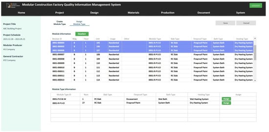 To reduce the defect rate in the module manufacturing process, it is important to clearly identify the target defect and its cause. In large projects where many identical modules are built, it is difficult to identify and track individual modules. The developed system manages module information by dividing it into information about each module and information about the module type. Module information was divided based on module ID, building, floor, room number, and use to prevent duplicate management of modules. Generally, modules manufactured in a modular project are constructed differently, depending on the structural systems, material type, and construction methods applied to each module. Therefore, changes in module types lead to changes in key quality check items for the module manufacturing process. Therefore, the modular factory quality information management system was developed to classify and manage module types to effectively manage module production inspection information. Therefore, 86 modular building projects undertaken in Korea from 2003 to 2020 were analyzed to identify and predefine the different types of modules. First, the module types were classified by examining the commonly applied construction methods regardless of the module type and analyzing the construction methods involving different construction processes. Therefore, depending on the type of slab construction method (wet or dry floor), type of fireproof construction (fireproof painting, fireproof spraying, or encasement fireproofing), type of toilet construction (wet or dry toilet), and heating construction (wet or dry heating), 24 module types were predefined. In addition, because the predefined module types may not be comprehensive, the developed quality information management system also includes a function to create and manage module-type information. The user can set the types of slab construction, fireproof construction, toilet construction, and heating construction for each module using the module type management function. Information on the module type is registered in the system according to the set construction method, and the module manufacturing process and main inspection items of each process are determined for each registered module type. In addition, by designating module type information to each previously created module, inspection items and contents for each module can be used in the production inspection step. Figure 6 shows the process of assigning the created module type to the created module information.
