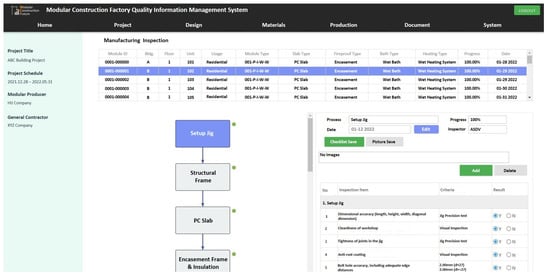 The module production management function can manage test information and production inspection information generated during the production of each module. Module test management was developed to manage various test information to ensure module performance, such as fire resistance, waterproofness, and airtightness. The user can manage information such as test types, standards, and scores through the module test management function. Module manufacturing inspection management was developed to manage manufacturing inspection information for each process according to each module type. As mentioned above, the developed system includes data on the manufacturing process and a step-by-step inspection checklist according to 24 predefined module types. Similar to material inspection management, the checklist for manufacturing inspection can be added and edited by the user. Production inspection is conducted on the entire module input in the module information management function. The module manufacturing inspection management function is shown in Figure 8. The information of all modules included in the project and information of the module selected for inputting the current inspection result are displayed at the top of the production inspection function screen. The process status of the module is displayed on the left side of the screen. The diagram schematizes the production process and inspection progress of the module. When all inspection items in the process are completed, the inspection items in the next process are displayed. The manufacturing inspection status indicator appears in the upper-right corner of the diagram, and the process under inspection is displayed in black; when all inspection items are completed without nonconformity, in green; and when one or more nonconformities occur, in red. The user can check the production and inspection status of individual modules through the module manufacturing inspection management function.