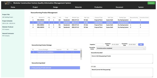 The main function of the system is to manage the quality information related to design, materials, and construction in module factory production according to the information standardization result. The design management function aims to manage the quality information related to the design of the modular project. Design-related quality information includes the revision history of design documents, review opinions, and special matters in the review and revision stage. The design management function allows for efficient tracking and management of design document information. It involves separating basic design documents and factory manufacturing drawings according to the type of design documents, thus improving the identification of design quality information. System users can systematically manage design document information through the design management function. Furthermore, it is possible to prevent problems related to the quality of design documents, such as discrepancies between design documents, because sharing work contents with other fields is simplified.