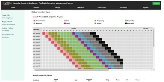 Manufacturing management targets module manufacturing inspection and test information management. The module manufacturing inspection function manages inspection information for each module manufacturing process. Further, manufacturing inspection utilizes the checklist included in the system database in advance, and the user can edit the checklist, similar to in the material inspection function. Meanwhile, when a large number of modules are manufactured, determining the inspection progress of each module may be difficult. Accordingly, a function should be prepared to provide information on the module inspection progress of the entire modular project, see Table 2—Modular Quality Information Management System Configuration Menu.