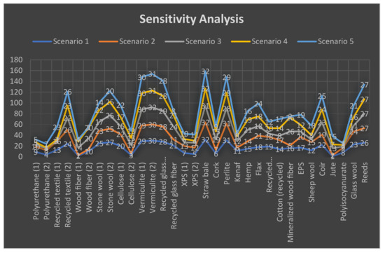 According to the results of scenario 1, the first 10 materials are as follows, respectively: jute, wood fiber (1), cellulose (2), polyurethane (2), XPS (2), cork, XPS (1), polyisocyanurate, polyurethane (1), and wood fiber (2). According to the results of scenario 2, the first 10 materials are as follows, respectively: wood fiber (1), jute, cellulose (2), wood fiber (2), mineralized wood fiber, kenaf, cork, polyurethane (2), polyisocyanurate, and polyurethane (1). According to the results of scenario 3, the first 10 materials are as follows, respectively: recycled textile (1), polyisocyanurate, polyurethane (1), polyurethane (2), sheep wool, recycled PET (commercial), XPS (1), cotton (recycled), XPS (2), and EPS. According to the results of scenario 4, the first 10 materials are as follows, respectively: polyurethane (2), recycled textile (1), polyisocyanurate, XPS (2), polyurethane (1), XPS (1), jute, sheep wool, kenaf, and recycled PET (commercial). According to the results of scenario 5, the first 10 materials are as follows, respectively: wood fiber (2), mineralized wood fiber, polyisocyanurate, wood fiber (1), polyurethane (1), kenaf, polyurethane (2), recycled glass fiber, cork, and XPS (1). The insulation material with the best performance varied in all scenarios. This means that the MACONT method adapts to the changes in the criteria weights. In other words, this method is sensitive to changes in the criteria weights. In addition, according to all scenarios, there are three insulation materials in the top 10: polyisocyanurate, polyurethane (1), and polyurethane (2).