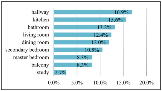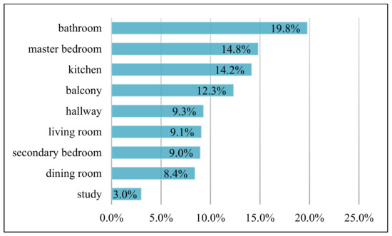 In total, 150 responses were received from cities with a low level of COVID-19 pandemic severity. These residents provided 924 entries on various indoor problems. These entries are mainly related to bathrooms (19.8%), followed by master bedrooms (14.8%), kitchens (14.2%), balconies (12.3%), hallways (9.3%), living rooms (9.1%), secondary bedrooms (9.0%), dining rooms (8.4%), and studies (3.0%). Most of these dissatisfactions concentrated on bathrooms, master bedrooms, kitchens, and balconies (Figure 1).