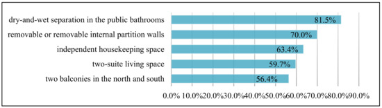 In terms of optimization of indoor space after the pandemic, 70.0% of the residents expressed that the internal partition walls of their apartment can be removed or moved in order to have a more flexible space. Moreover, 59.7% of the residents would like to have a two-suite living space, which is conducive to having no interference between the two generations and quarantine during the pandemic. Furthermore, 63.4% of the respondents express willingness to set up an independent housekeeping space; 81.5% of the residents expressed they would enjoy dry-and-wet separation in the public bathrooms; And 56.4% of the respondents would like set up two balconies in the north and south, as well as a separation between leisure and drying (Figure 5).