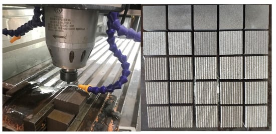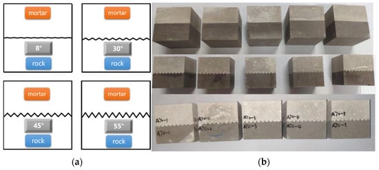 In order to study the effect of roughness on the shear characteristics of the binary medium of mortar and rock, the engraving machine was used to engrave 10 sawtooths on the rock surface. As shown in Figure 1, the sawtooth angle is set to 8°, 30°, 45°, and 55°, and the size of the rock is 70 mm, 70 mm, and 35 mm in length, width, and height, respectively. After the rock is processed, it is poured on the serrated surface of the rock with the prepared cement mortar, the cement (Hunan Ningxiang Nanfang Cement Co., LTD, Hunan Ningxiang, China) grade is 42.5, and the particle size of the river sand is less than 0.5 mm. The ratio of cement, sand, and water by weight are 2:1:0.6, and the size of the specimen after pouring is 70 mm × 70 mm × 70 mm (as shown in Figure 2). The rock selected for this test is greywacke from Hunan, China, which is a relatively uniform sedimentary rock with relatively stable mechanical properties. The uniaxial compressive strength of the rock is 72 MPa, the bond force is 9 MPa, and the internal friction Angle is 61.8°. The uniaxial compressive strength of mortar is 15.6 MPa, the bond force is 3.12 MPa, and the internal friction Angle is 60.4°.