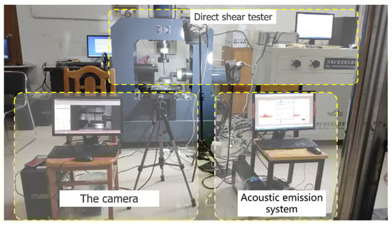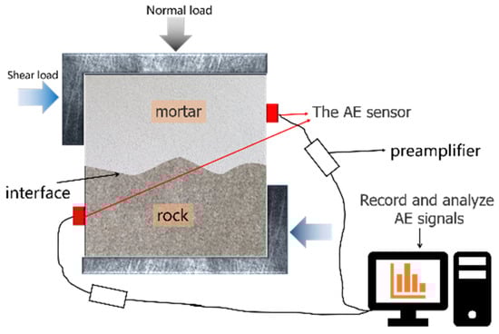 AE monitoring is carried out during the shearing process. The position of the AE sensors and the signal acquisition process is shown in Figure 4. The AE monitoring system used in this paper is a 16-channel fully digital acoustic emission system. AE signals were detected by two AE sensors and the sampling frequency for recording wave-forms was 10 MHz. AE waves were amplified with 40 dB gain by a pre-amplifier. AE sensors were attached to the surface of the specimen with vaseline, so that the sensor face and the specimen surface have a good contact for the signal detection. The thresh-old level is 45 dB.