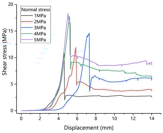 In order to compare the difference in shear mechanical properties of rock and mortar rock binary media, direct shear tests were carried out on intact rock and binary media samples, respectively. The intact rock sample size, normal stress, and shear rate are all the same as those of the binary medium sample. The shear stress-displacement relationship of rock and binary medium is shown in Figure 5 and Figure 6.