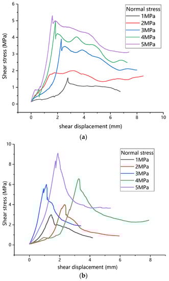 As shown in Figure 3, the direct shear test under constant normal stress was carried out by the YZW100 multifunctional rock direct shear instrument developed by Jinan Mining and Rock (Jinan, Shandong, China). According to the rock physical property test procedures [], the normal stress should not be lower than the design stress, the normal stress in this test is set to 1 MPa, 2 MPa, 3 MPa, 4 MPa, and 5 MPa respectively. In order to make the shear loading element contact the specimen quickly, the shear loading adopts the combined loading mode of pre-control and displacement control, that is, when the pre-control shear force reaches 1 KN, it is switched to the displacement control loading mode, and the loading speed is 0.01 mm/s.