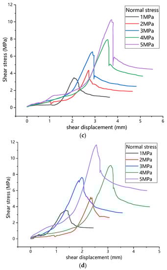 In the plastic failure stage, both the sawtooth angle and the normal stress affect the failure mode of the binary medium. In the case of a small sawtooth angle, as shown in Figure 6a, two stress peaks appear in the curve, the stress drops rapidly after the first peak and decreases gently at the second peak. The failure mode of the specimen is brittle failure followed by plastic failure. Brittle failure occurs when the mortar and rock cementation surface are separated, and the subsequent ductility fluctuation is the plastic failure caused by slip friction. In the case of a large sawtooth angle, as shown in Figure 6c,d, the curve quickly drops after reaching the peak value and enters the residual stress stage. The specimen showed brittle failure, and the greater the normal stress, the more obvious the brittle failure phenomenon. When the sawtooth angle and normal stress are large, the sawtooth on the mortar side is prone to shearing damage.