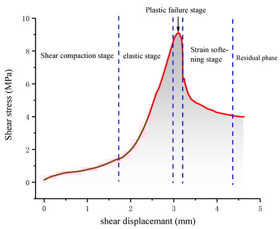 Figure 5 shows that the intact rock exhibits elastic-brittle failure in shear, and the shear stress before failure is linearly related to the shear displacement. In order to easily reflect the shear stiffness of rocks and binary media, the value of k is defined as the ratio of the change of shear stress to the change of shear displacement in the elastic section, that is, k = Δτ/Δδ, in MPa/mm, and k’ is the ratio of shear stress change to shear displacement change before the elastic stage. According to the change in shear stiffness, the shear curve can be divided into five stages: the shear compression stage, the elastic stage, the plastic failure stage, the strain softening stage, and the residual stress stage, as shown in Figure 7.
