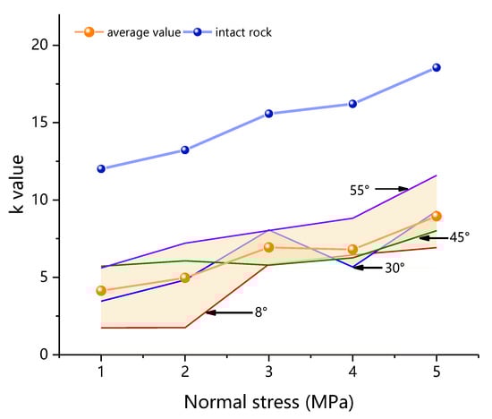 Table 1 summarizes the k values of the binary medium samples and intact rocks. The relationship between the k value and normal stress is plotted in Figure 8. It can be seen from Figure 8. that with the increase of normal stress, the k values of rock and binary medium show an upward trend, and the k value of rock is greater than that of the binary medium. The sawtooth angle has little effect on the k value of the binary medium, but the increase of the normal stress has a stronger compacting effect on the micro-cracks in the specimen, so it has an increasing effect on the shear stiffness of the specimen. The mortar-rock binary medium is worse than the intact rock in terms of density and integrity, so its shear stiffness is much smaller than that of the intact rock.