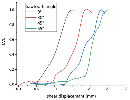In order to analyze the influence of the serration angle before the elastic stage on the shear stiffness, the k’ value was calculated for the shear results of the binary medium with different serration angles under the normal stress of 2 MPa. The ratio of k’ to k reflects the shear stiffness before the elastic stage. Figure 9 shows the relationship between shear displacement and the ratio. It can be seen from Figure 9. that with the increase of shear displacement, the ratio first increases slowly, then suddenly rise, and lastly remains the same. The change in the ratio indicates that the shear stiffness has changed, and the shear transitions from the shear compression stage to the elastic stage. We use this as the basis for dividing the shear compression stage and the elastic stage in the shear process. With the increase of the sawtooth angle of the binary medium, the displacement corresponding to the sudden change of the ratio is larger, which indicates that the greater the roughness of the interface of the binary medium, the later the specimen transitions to the elastic stage.