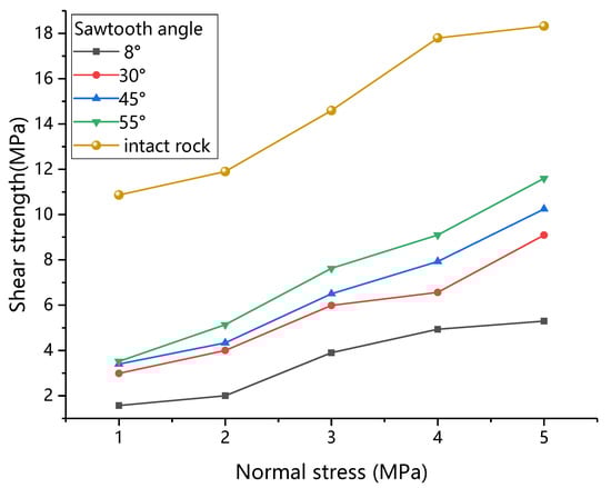 In order to study the effect of sawtooth angle and normal stress on the shear strength of binary media, the shear strength of specimens with different sawtooth angles under different normal stresses is shown in Figure 10. It can be seen from the Figure that with the increase of normal stress and sawtooth angle, the shear strength increases. According to the Mohr-Coulomb criterion, the relationship between the normal stress and the shear stress at each sawtooth angle in Figure 10 can be linearly fitted to obtain the cohesive force and internal friction angle of the rock and mortar-rock binary medium. The cohesive force of the rock is 9 MPa, and the internal friction angle is 61.8°, as shown in Figure 11.