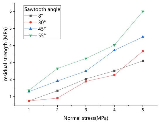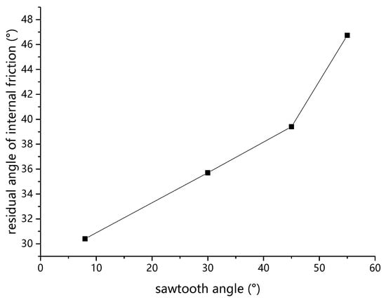 In the residual stage, the shear stress-displacement curve of the binary medium basically remains unchanged at the residual stress. Figure 12 shows the relationship between the residual strength of the specimens and the normal stress. It can be seen from the Figure that with the increase of the normal stress, the residual strength of the binary medium tends to increase. According to the Mohr-Coulomb criterion, the residual internal friction angle of binary media with different roughness is obtained. Figure 13 shows the relationship between the sawtooth angle and the residual internal friction angle. It can be seen from the Figure that the residual internal friction angle of the binary medium is in the range of 30–48°, and increases with the increase of the sawtooth angle. The larger the sawtooth angle, the greater the roughness of the contact interface after shearing is, which provides a greater bearing capacity in the residual stage. Interestingly, the residual internal friction angle of the specimen with the sawtooth angle of 55° is larger than the internal friction angle of the specimen with the sawtooth angle of 8°. It shows that when the sawtooth angle is large, even if the structure is damaged, the residual bearing capacity of the binary medium is larger than that of the small sawtooth angle binary medium without damage.