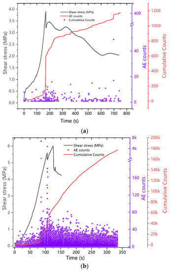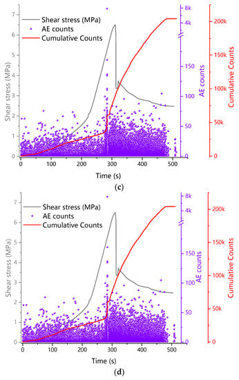 AE counts is the number of times the AE signal excursions over the AE threshold. Figure 14 shows the relationship between AE counts, AE cumulative counts, and time during the shearing process of the binary medium with different sawtooth angles under the normal stress of 3 MPa. It can be seen from the Figure that in the shear compaction stage and the elastic stage, the AE count is low, and the AE cumulative counts increase slowly, which indicates that the internal cracks of the specimen develop slowly before failure. In the failure stage, super large AE counts appeared, and the AE cumulative counts increased suddenly, which indicated that the micro-cracks in the specimen rapidly expanded and penetrated each other during the failure stage, forming macroscopic failure. In the residual stage, the AE counts dropped, but were generally higher than those before shear failure, and the cumulative AE counts showed a rapid growth pattern. The main failure mode of the specimen in the residual stage is sliding friction failure, which is more severe than the acoustic emission in the elastic stage and the shear compaction stage, but there is almost no development and penetration of micro-cracks. Comparing Figure 14a–d, it can be found that the greater the interface roughness of the binary medium, the greater value of the AE counts and the AE cumulative counts. The increase of the sawtooth angle makes the shear damage more severe, and the AE signal is easier to monitor.