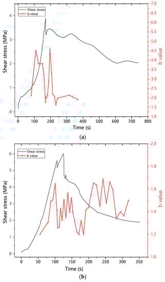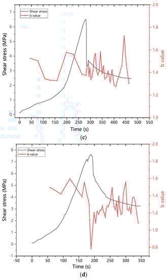 In this paper, the self-compiled MATLAB program is used to calculate the b value in the shearing process of binary media with different sawtooth angles, and the relationship between time and b value is plotted in Figure 15. It can be seen from the Figure that in the shear compaction stage and the elastic stage, the b value increases slowly or does not change, indicating that in these two stages, the formation and expansion of tiny cracks mainly occur inside the specimen but have not yet penetrated. In the failure stage, the b value dropped suddenly, indicating that a large number of micro-cracks penetrated through the specimen to form macro-cracks, and caused the instability of the structure. In the residual stage, the b value of acoustic emission varies greatly, but the overall trend is gradually increasing, indicating that the proportion of large-scale cracks in the specimen decreases. Observing the relationship between the change of the b value and the shear stress in the figure, before the shear stress reaches the peak value, the AE b value will drop suddenly, indicating that the sudden drop of the b value can provide an early warning for the macroscopic damage of the structure.