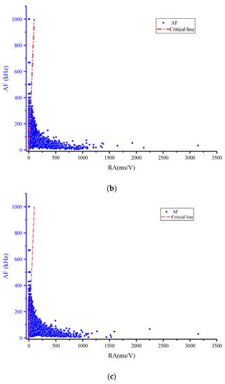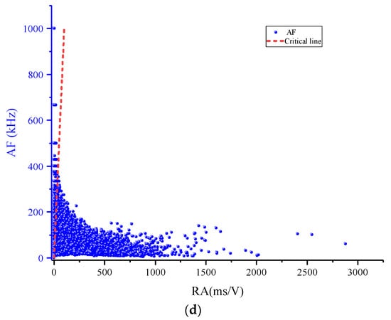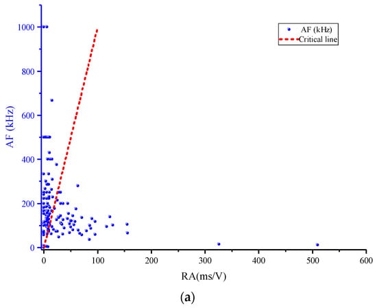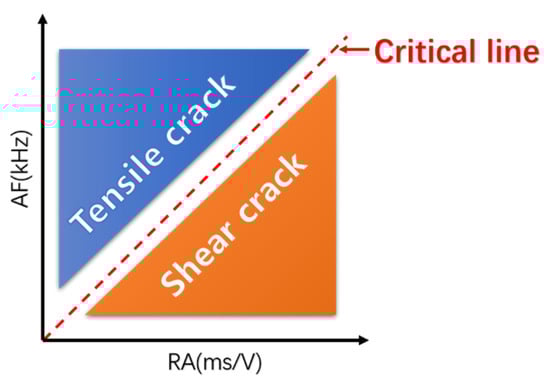 According to the Japanese standard JCMS-III B5706 [], as shown in Figure 16, tensile cracks and shear cracks can be distinguished by two parameters, AF and RA. The slope of the dividing line is defined as r, and the signal is defined as shear failure signal, the signal with AF/RA > r is defined as tension failure signal, and the r value is between 0–200. AF is the average frequency, which is the ratio of ring count to duration in kHz. RA is the ratio of AE rise time to AE amplitude, Equation (5) [], in ms/V. The maximum voltage value of the AE signal can be converted from the AE amplitude, as shown in Equation (5).