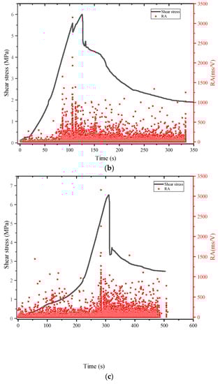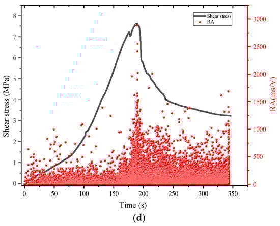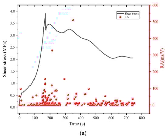 In order to analyze the development of tensile and shear cracks in the shearing process of the mortar-rock binary medium with different sawtooth angles, the relationship between RA and AF in the shearing process of four kinds of roughness binary mediums is shown in Figure 17, respectively. In this paper, based on previous experience [,,], the value of r is set to 50, it can be seen from the Figure that most of the signals are distributed below the critical line, that is, the shear crack acoustic emission signal is dominant in the entire shearing process. As the sawtooth angle increases, more signal points of obvious shear cracks are shown in the figure. (High RA value, low AF value). Figure 18 shows the change in the RA value during the shearing process. It can be seen from the Figure that the RA value is evenly distributed in the low area during the shear compaction and elastic stages. In the plastic failure stage, the RA value suddenly increased to a peak value, and the signal was denser, indicating that the shear cracks in the specimen developed and penetrated rapidly during this stage. In the residual stage, the RA value of acoustic emission is mostly reduced, and the distribution range is larger than the RA value of the shear stage and the elastic stage. This indicates that in the residual stage, frictional slip between the two mediums occupies the dominant failure mode.