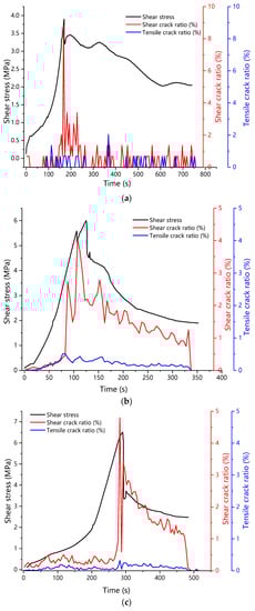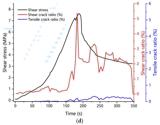 In order to analyze the proportion of shear cracks and tensile cracks in the whole shearing process, Figure 19 shows the proportion of shearing and tensile cracks in all cracks during the shearing process. The red curve in the Figure is the proportion of shear cracks, and the blue curve is the proportion of tensile cracks. It can be seen from the Figure that in most cases, shear cracks are more than tensile cracks, indicating that the tangential stress is the dominant factor leading to the failure of the binary medium in the test, especially in the failure stage and the residual stage. In the shear compaction stage and the elastic stage, the ratio of shear cracks and tensile cracks basically remained stable, but after entering the plastic failure stage, the shear cracks increased suddenly and fell back in the residual stage, but still maintained a high ratio, while the changes in these stages of tensile crack are not obvious. This shows that shear cracks develop violently in the plastic failure stage and residual stage from the aspect of crack ratio, and the main factor leading to structural instability is the development of shear cracks. Corresponding the change of shear crack ratio with the change of shear stress, the sudden increase of shear crack ratio is earlier than the peak of stress, so the sudden increase of shear crack ratio can play a good role in predicting the failure of specimen or structure.
