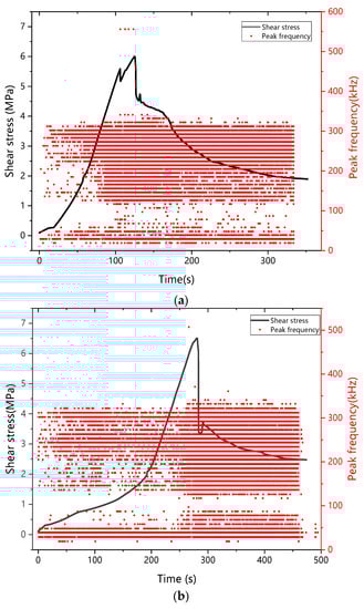 Combining Figure 20 and Figure 21, it can be seen that the peak frequency of the AE signal of the binary medium in the direct shear test is related to the shear stress level. In the shear compaction stage and the elastic stage, the peak frequencies of the AE signal are mainly concentrated in the range of 20–40 kHz and 200–320 kHz. During the plastic failure stage and the residual stage, the peak frequency of the AE signal changed abruptly, with a very large peak frequency, accounting for about 0.01%, and a large number of mid-peak frequencies in the 120–200 kHz frequency band. This indicates that the peak frequency band broadens with the increase of shear stress during the shearing process. M. Cai et al. [] pointed out that the peak frequency of the AE signal corresponds to small-scale cracks, and the low frequency corresponds to large-scale cracks. Combined with Figure 21, the peak frequency range of the two specimens in the direct shear test is 0–600 kHz, but the peak frequency of 0–340 kHz accounts for more than 99.99%. Therefore, the signal with a peak frequency of around 300 kHz is a high-frequency signal, and the signal with a peak frequency of about 100 kHz is a low-frequency signal. The high-frequency signal and the low-frequency signal correspond to the micro-crack and through-crack generated in the specimen, respectively.