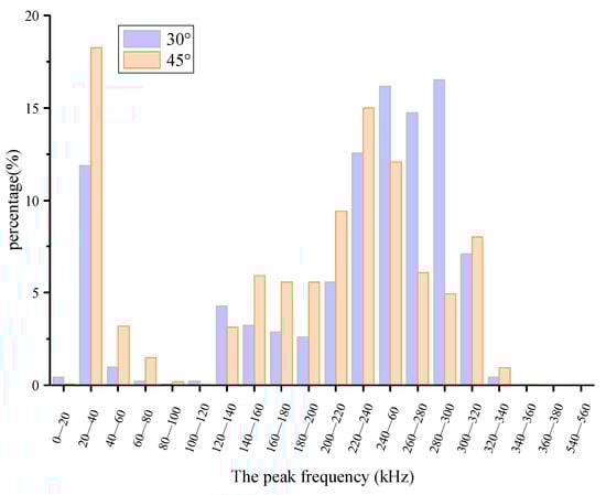 An acoustic emission signal is a kind of non-stationary signal, and fast Fourier transform (FFT) is a classical spectrum analysis method to analyze a non-stationary signal. The spectral characteristics of the AE signal generated by the rock can characterize the stress state, structure, and mechanical properties of the rock. Many problems that are difficult to visualize in the time domain can be easily identified through acoustic emission spectrum analysis. The peak frequency [] (in kHz) is defined as the point in the Power Spectrum at which the peak magnitude occurs. A real time FFT is performed on the waveform associated with the AE hit. The peak frequency is the frequency of maximum amplitude []. In this paper, the peak frequency information of each sample at different times during the whole loading process is collected, and the variation and distribution of the peak frequency during the shearing process are analyzed. In this paper, the experimental results of the binary medium with the sawtooth angle of 30° and 45° under the normal stress of 3 MPa are selected as the representative for specific analysis. Figure 20 shows the peak frequency changes of the sheared acoustic emission signals of the two samples during the direct shearing process. According to the distribution range and concentrated area of the peak frequency value, the peak frequency distribution map of the whole shearing process is obtained, as shown in Figure 21.