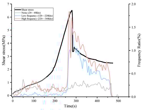 In order to further analyze the evolution law of the internal fracture of the structural plane at each stage of shearing, the percentage of each frequency interval in each time period was calculated. Figure 22 shows the relation between the percentage of each frequency interval and time. It can be seen from the Figure that the percentage of the signal with a peak frequency of 20–40 kHz is almost unchanged as time increases, indicating that the peak frequency signal of 20–40 kHz is a noise signal due to the equipment or experimental conditions. The peak frequency of the AE signal in the binary medium direct shear test is the high-frequency signal at 220–340 kHz, and the low-frequency signal at 120–220 kHz. In the shear compaction stage, the high-frequency signals tend to increase, and the number of low-frequency signals is much lower than that of the high-frequency signals, and there is almost no change, indicating that a large number of micro-cracks represented by the high-frequency signals are formed. In the elastic stage, the percentage of high-frequency signals decreased, and the number of low-frequency signals changed little, indicating that under the combined action of normal stress and shear stress, the micro-cracks temporarily closed and suspended development, and no large through cracks were formed. In the plastic failure stage, both high-frequency and low-frequency signals showed a sudden increase, indicating that the micro-cracks rapidly developed and penetrated to form large-scale cracks. And the peak value of the low-frequency signal and the peak value of the shear stress of the specimen occurred synchronously, but the peak value of the high-frequency signal occurred earlier than the two, indicating that the sudden increase of the high-frequency signal is helpful in the prediction of structural instability. In the residual stage, the number of high-frequency and low-frequency signals decreased, but was still much larger than that in the shear compaction stage and the elastic stage, indicating that the slip friction failure caused a large number of micro-cracks and large cracks in the specimen.