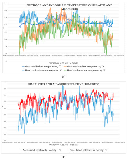Analyzing the model, the problem of overheating in the summer period was highlighted, so the summer period from 1 May to 30 September was considered in detail. In the period from 10 May to 15 May, the measured temperature at certain moments is 15 degrees Celsius higher than the simulated temperature. Analyzing the data of the measured and simulated outdoor and indoor temperatures, the following observations can be noted: in the period from 4 June to 15 June, the measured temperature is on average 5 °C higher than the simulated temperature; from 5 July to 20 July, the simulated temperature is 10 °C below the measured temperature (Figure 3a).