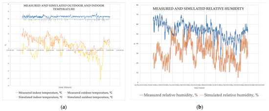 Considering the lethal period from 6 November to 20 December, we can make the following observations: the measured air temperature is on average 1.5 °C higher than the simulated temperature. This factor can affect the total annual consumption. However, the measured outdoor temperature during the period from 5 to 15 November is 10 °C higher than the simulated temperature, and during the period from 13 to 17 December, the measured temperature is 15–20 °C higher than the simulated temperature (Figure 4a,b).