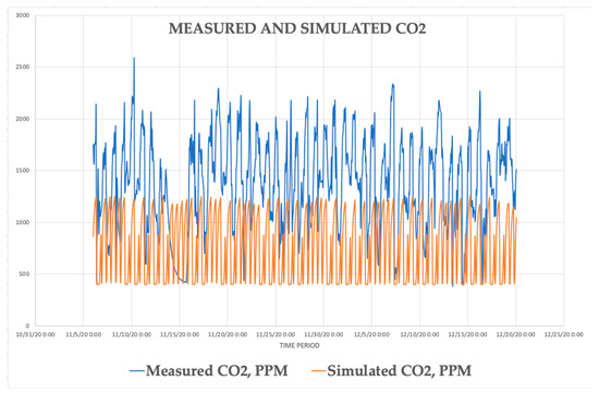 The measured and simulated CO2 readings show a significant difference of 55.82%. The simulated CO2 average is 773 PPM, and the measured average is 1386 PPM (Figure 5). According to EN 16798-1 “Indoor Environmental Quality Categories”, the indoor comfort quality levels have the following breakdown: QI—high, QII—medium, QIII—moderate and OIV—low. An average level of CO2 would be most applicable. The highest level can be chosen for areas where people with special needs are (children, the elderly, people with disabilities). Lower levels do not pose any health risk but may increase discomfort. The CO2 concentration limits are based on the indoor concentration of the substance, taking into account the outdoor concentration. In areas with comfort quality levels: QI—CO2 delta 550—in the living room and 380 in the bedroom, QII—CO2 delta 800—in the living room and 550 in the bedroom, QIII—CO2 delta 1350—in the living room and 950 in the bedroom and QIV—CO2 delta 1350—in the living room and 950 in the bedroom.