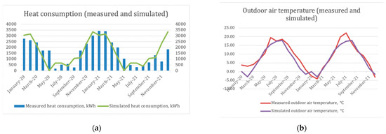 (a) Measured and simulated heat consumption for Scenario 1B; (b) measured and simulated outdoor air temperature.