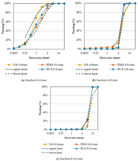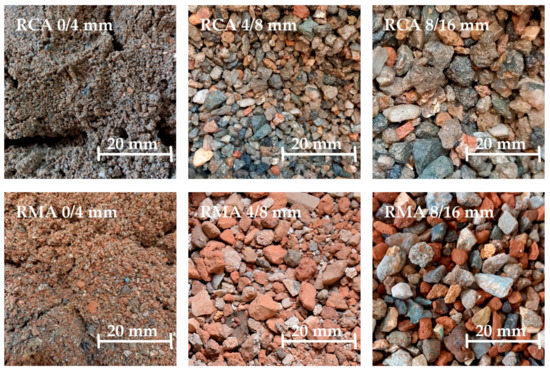 Recycled concrete aggregate (RCA) and recycled masonry aggregate (RMA) of fraction 0–4, 4–8 and 8–16 mm.