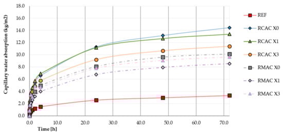Comparison and progression of capillary water absorption of NAC, RCAC, and RMAC.
