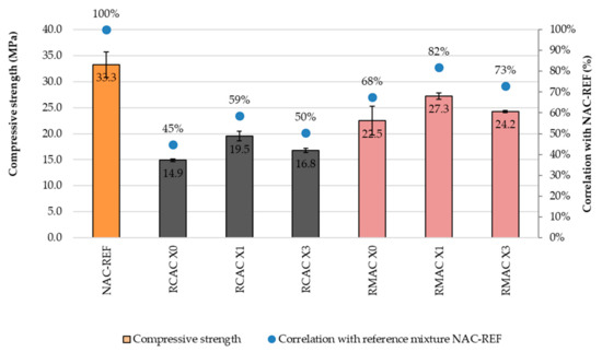 Comparison of compressive strength of NAC, RCAC, and RMAC at age 28.