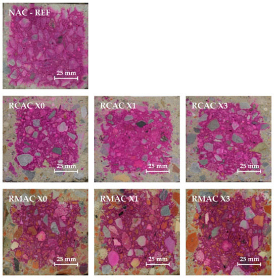 Carbonation resistance is the essential index of durability of reinforced concrete structures negatively influenced by the RA contained in concrete mixture due to its relation with the porosity of the aggregate. The presence of carbon dioxide (CO2) causes physicochemical process with several chemical reactions promoting the reduction of pH in concrete. Concrete with a lower pH loses the ability to protect the reinforcement, which could more easily corrode. The microstructure and properties of concrete have been negatively influenced by CO2, as has been described in the previous studies. However, in some cases, CO2 penetrating the concrete mainly through a diffusion mechanism can form calcium carbonate (CaCO3) with calcium hydroxide (Ca (OH)2) in the presence of moisture. They can slightly increase strength and reduce permeability due to CaCO3 deposits in the pores of the cement matrix. [13,105]. Prismatic samples 100 × 100 × 400 mm3 in which the depth of reduction of the concrete pH was measured by the phenolphthalein method are shown in Figure 8. The results are also compared with NAC by the indicator of increasing the depth of carbonation (see Table 8).