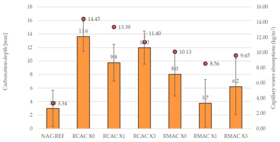 In general, the carbonation results show the deep effect of CO2 on all RAC mixtures results in a significant improvement in the carbonation resistance of RAC with the addition of crystalline admixture. This carbonation depth of RMAC X0 without crystalline admixture is almost 2.7 times higher corresponding to the results presented in the previous study [13], where for the mixture in which only the coarse aggregate is replaced, the carbonation depth is 2.5 times higher in comparison to NAC. However, in this study, also the fine fraction of RMA was used for concrete. The most positive influence of the crystalline admixture was found in the case of RMAC mixtures at 1.5%. However, the measured values of RMAC with 3% of crystalline admixture also show lower carbonation depth in comparison with RMAC X0. Furthermore, the indicator of increase in carbonation depth of RMAC X1 is only about 25% deeper compared to the reference mixture. Additionally, the indicator of increase of carbonation depth of RMAC X3 is shown to be more than two times deeper than the carbonation depth compared to the reference mixture. Furthermore, the RMAC results of the carbonation resistance show the correlation between capillary water absorption and carbonation depth (see Figure 9).