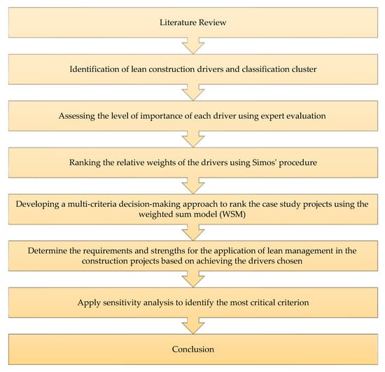 The methodology adopted in the research work, as shown in Figure 1, takes into account the following: (i) a review of the literature on lean drivers; (ii) identification of key drivers and grouping a shortlist of the most important drivers for successful lean construction implementation; (iii) assessing the level of importance of each driver using the evaluation of 7 experts and ranking the relative weights of the drivers using Simos’ procedure; (iv) development of a multi-criteria decision-making approach to rank the case study projects using the weighted sum model (WSM), and then determine the requirements and strengths for the application of lean management in the construction projects based on achieving the drivers chosen; and (v) apply sensitivity analysis to identify the most critical criterion and to examine the sensitivity of the driver, which influences the decision-making process.