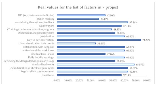 As demonstrated in Figure 3, the most often used factors in the case studies calculated by Equation (3) were day-to-day observation, standardized work, a clear definition of the client’s requirements, and just-in-time delivery. According to the case studies, more than 60% of the lean drivers are implemented in Egypt. This finding is in line with a study conducted in 2021 related to the adoption and knowledge level, which revealed that the adoption level of lean tools in Egypt was 74.7% [49].