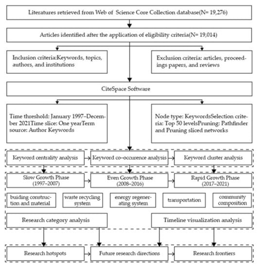 The core method of ZCCs is to build a community system with zero energy consumption [44]. The search was conducted for the topics “zero-carbon community” and “low-carbon community”, for any period where operation date was 22 March 2022. The keywords in the WoS Core Collection are selected as a raw source of the type of Article, Proceeding Paper, and Review. The records were exported as complete records of plain text file content and cited references. Then, CiteSpace 5.8R3 software was imported for calculation, analysis, and further procedures, and the ZCC research design is shown in Figure 1.