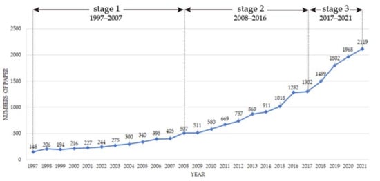 The change in the numbers of publications is an essential indicator of the evolution in the research field. By using CiteSpace, we removed duplicate articles. A total of 20,813 articles about the ZCC field were obtained, as well as the distribution of the number of articles issued per year. The analysis found that research on ZCCs and LCCs went through three phases of slow growth, steady growth, and then rapid growth from 1997–2022.